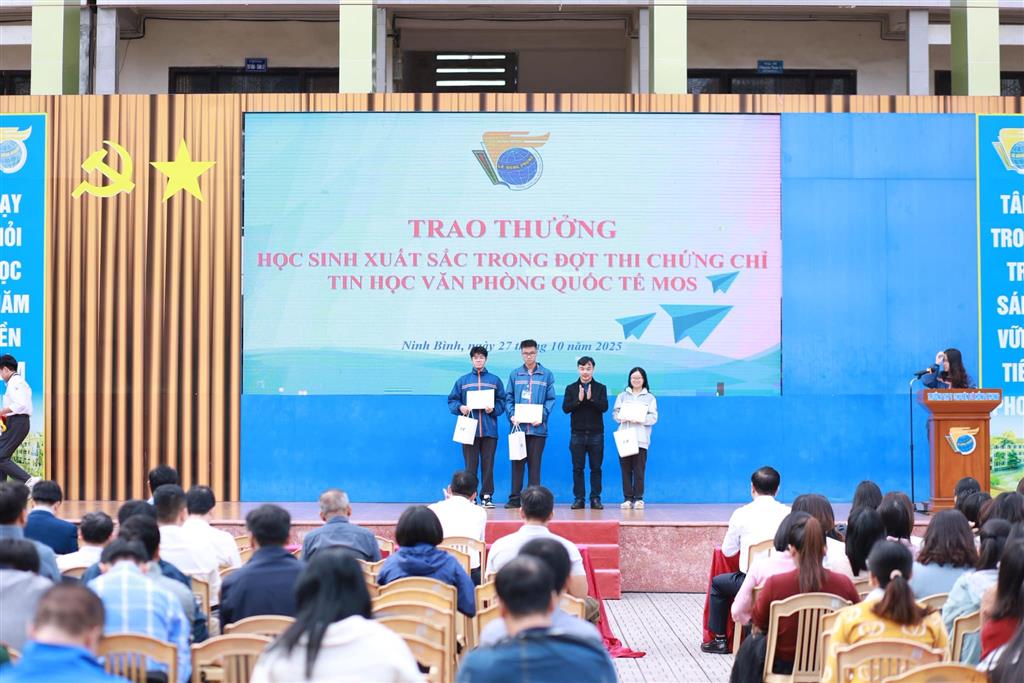 Thầy giáo Bùi Thái Học – Phó Bí thư Đảng ủy, Phó Hiệu trưởng nhà trường trao thưởng 3 học sinh đạt điểm số cao nhất 1000/1000 trong kì thi chứng chỉ MOS.