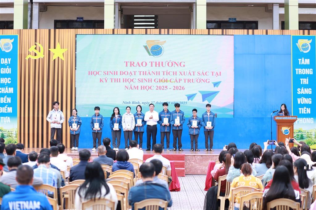 Thầy giáo Bùi Thái Học – Phó Bí thư Đảng ủy, Phó Hiệu trưởng nhà trường và thầy giáo Nguyễn Hữu Thiêm – Phó Hiệu trưởng nhà trường trao thưởng cho các học sinh đoạt giải Nhì kì thi HSG cấp trường