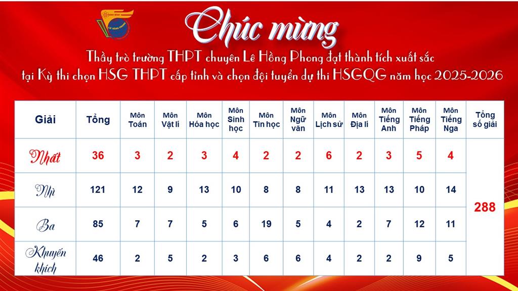 Kỳ thi học sinh giỏi THPT cấp tỉnh và chọn đội tuyển dự thi HSGQG tỉnh Ninh Bình năm học 2025 – 2026 đã khép lại, để lại niềm tự hào lớn lao cho thầy và trò trường THPT chuyên Lê Hồng Phong khi giành vị trí tiên phong, dẫn đầu 3 trường chuyên của tỉnh Ninh Bình cả về số lượng và chất lượng giải. Trong số 288 giải thưởng mà nhà trường đạt được, đặc biệt có 36 học sinh xuất sắc đã giành giải Nhất ở tất cả các bộ môn dự thi.