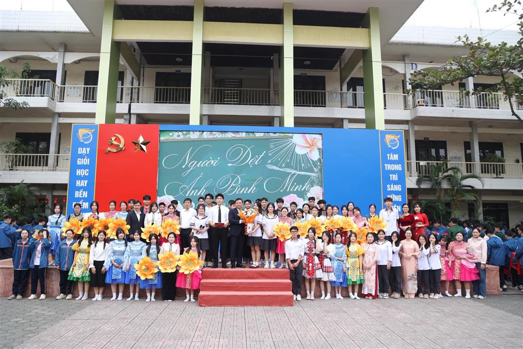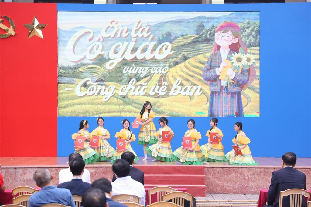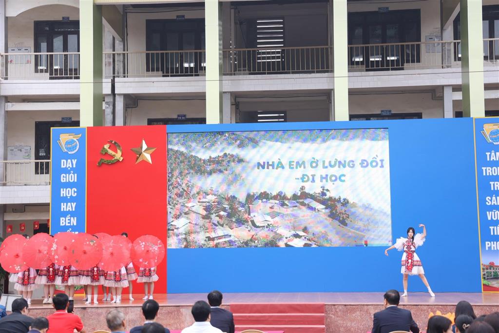 Trong không khí đầy xúc cảm ấy, khối chuyên Địa đã dẫn dắt người xem vào hành trình “Người dệt ánh bình minh” – câu chuyện về cô giáo rời bỏ phố thị để mang hơi ấm tri thức đến những bản làng xa xôi nơi đại ngàn.