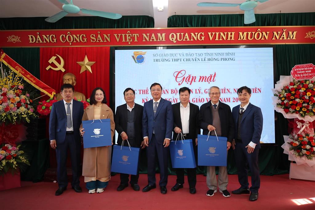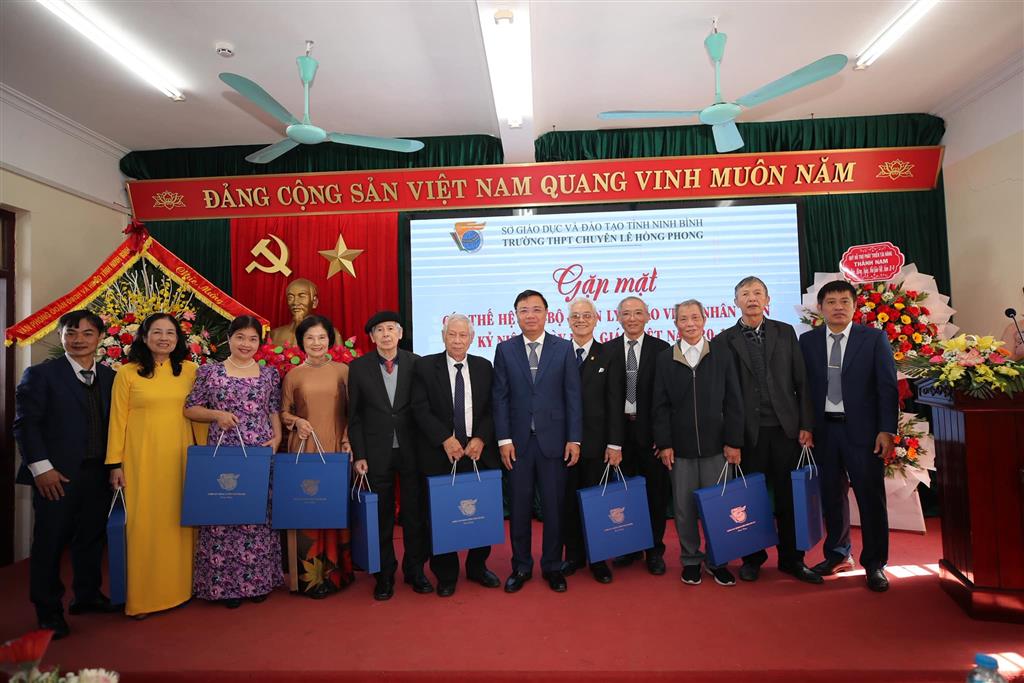 Những tiết mục văn nghệ mở màn đã mang đến cảm xúc nhẹ nhàng và lắng đọng, như lời chào gửi tới các đại biểu, cựu giáo chức và tập thể cán bộ, giáo viên đang công tác. Tinh thần “uống nước nhớ nguồn” được khơi dậy qua phần tuyên bố ý nghĩa của ngày hội tri ân, nhấn mạnh vai trò và giá trị bền vững của nghề dạy học trong hành trình hơn một thế kỷ hình thành và phát triển của nhà trường. Buổi gặp mặt đón tiếp sự hiện diện trân trọng của các thế hệ lãnh đạo và cựu giáo chức: Thầy Trần Bá Giao — Hội trưởng Hội Cựu Giáo chức Hà Nội; Cô Phạm Thị Ngọc Hạnh — Hội trưởng Hội Cựu Giáo chức Nam Định; các thầy nguyên Giám đốc Sở GD&ĐT Nam Định, nguyên Hiệu trưởng nhà trường như Thầy Nguyễn Tất Thắng, Thầy Cao Xuân Hùng; cùng các thầy cô nguyên Hiệu trưởng Vũ Đức Thọ, TS. Phạm Thị Huệ và đông đảo cựu cán bộ qua nhiều thời kỳ. Đại diện nhà trường có thầy Phạm Thanh Ngọc — Bí thư Đảng ủy, Hiệu trưởng cùng Ban Giám hiệu và tập thể cán bộ, giáo viên. Trong phát biểu chào mừng, lãnh đạo nhà trường nhấn mạnh truyền thống 105 năm của Lê Hồng Phong — một hành trình được xây dựng bằng trí tuệ, tâm huyết và cống hiến của nhiều thế hệ thầy cô. Những chia sẻ của đại diện Hội Cựu giáo chức và các thầy cô lão thành đã mang lại nhiều cảm xúc, như những dòng ký ức nghề nghiệp xen lẫn niềm tin gửi gắm vào thế hệ tiếp nối. Nhằm tri ân những đóng góp quý báu, nhà trường trao tặng hoa và quà kỷ niệm tới các đại biểu cựu giáo chức, đại diện Hội Cựu Giáo chức Hà Nội – Nam Định và các thầy cô từng công tác tại trường. Mỗi món quà, mỗi cái bắt tay là sự trân trọng dành cho những người đã đặt nền móng, bồi đắp cho ngôi trường trong suốt nhiều thập kỷ.