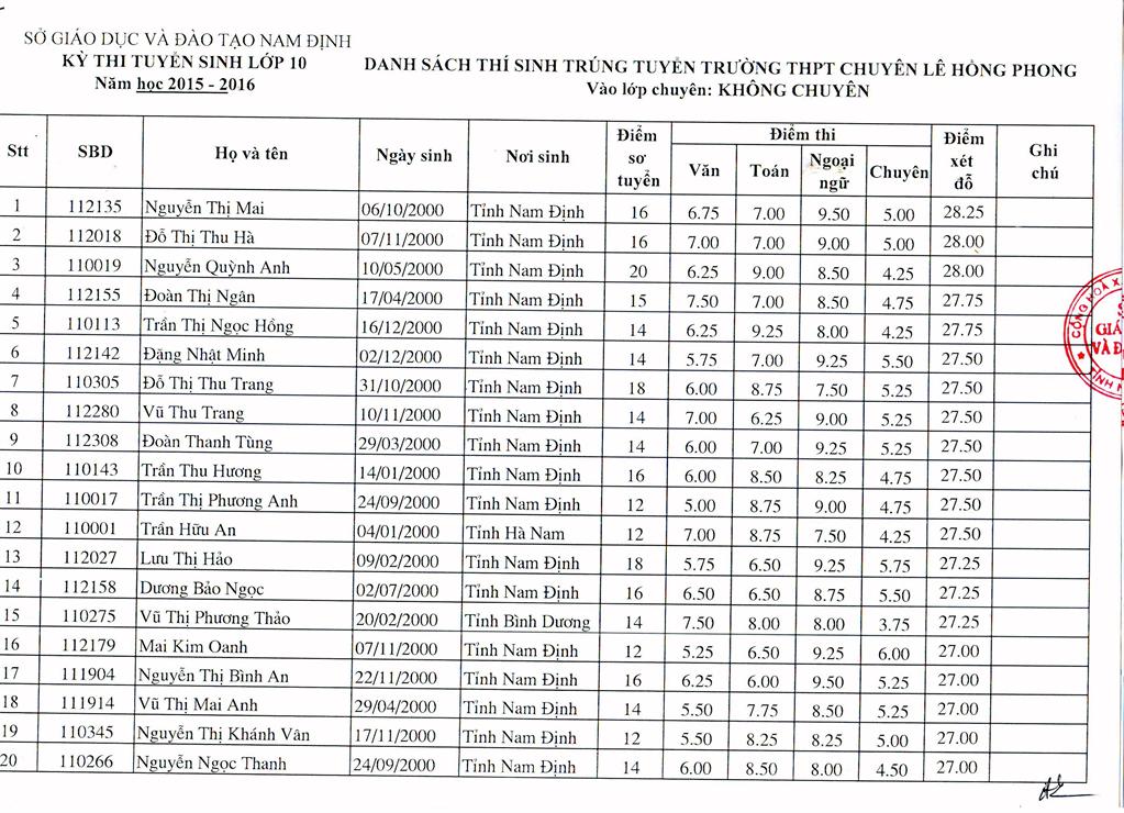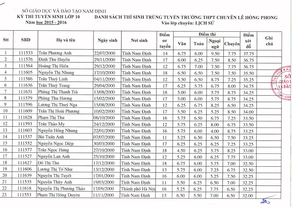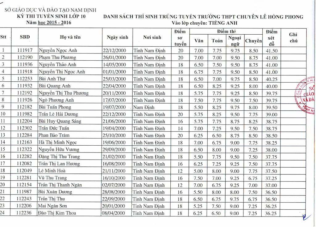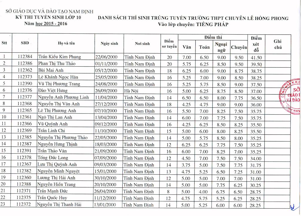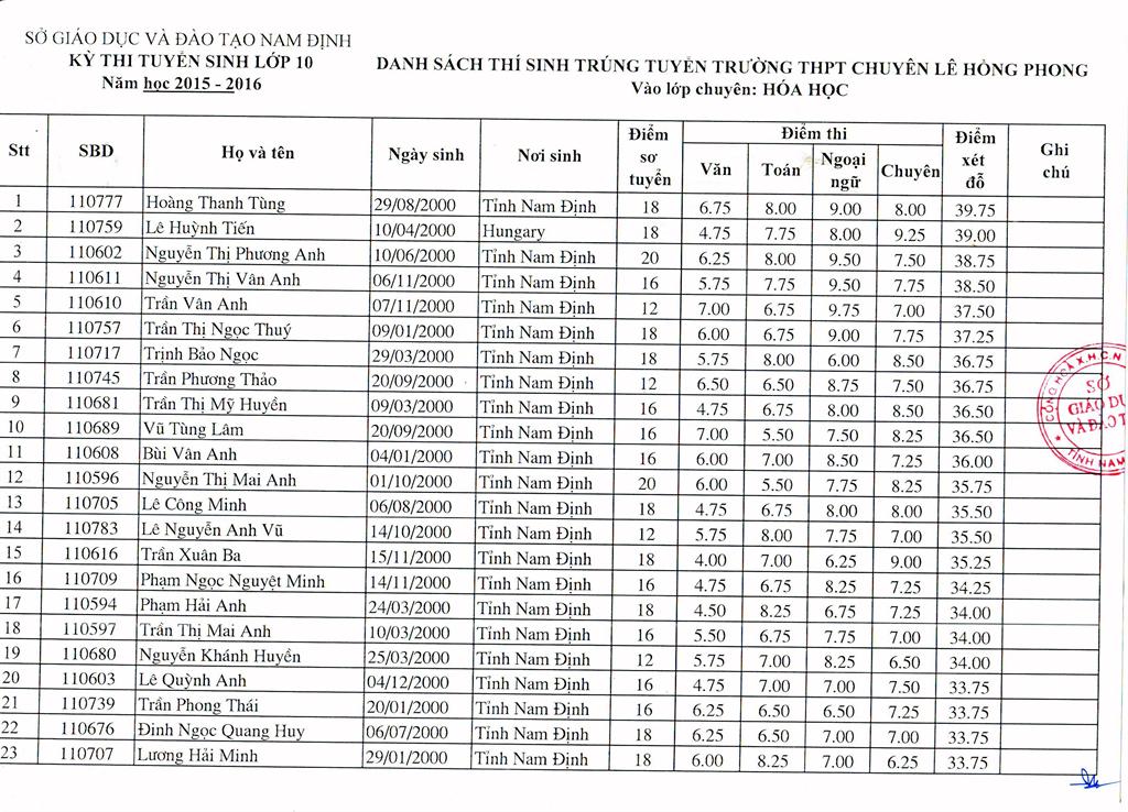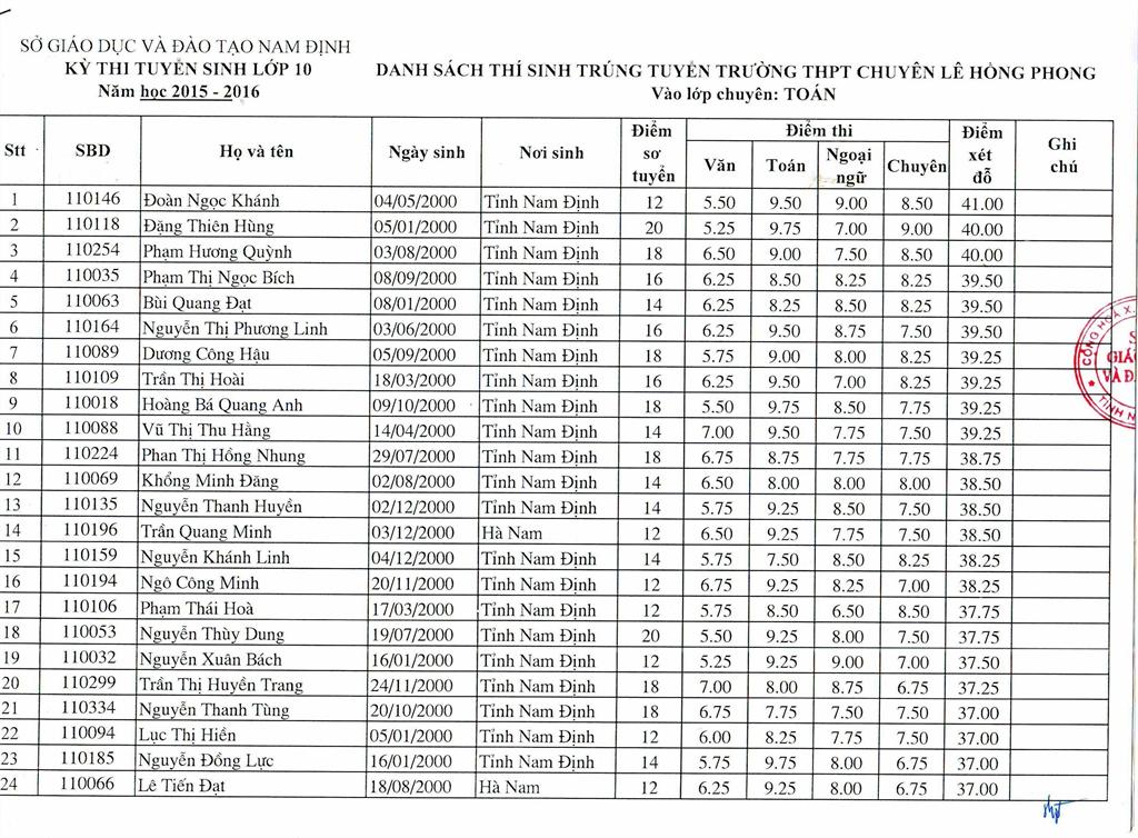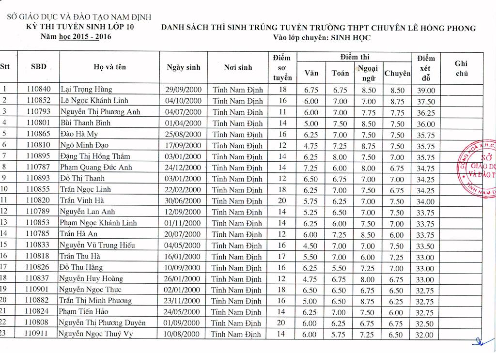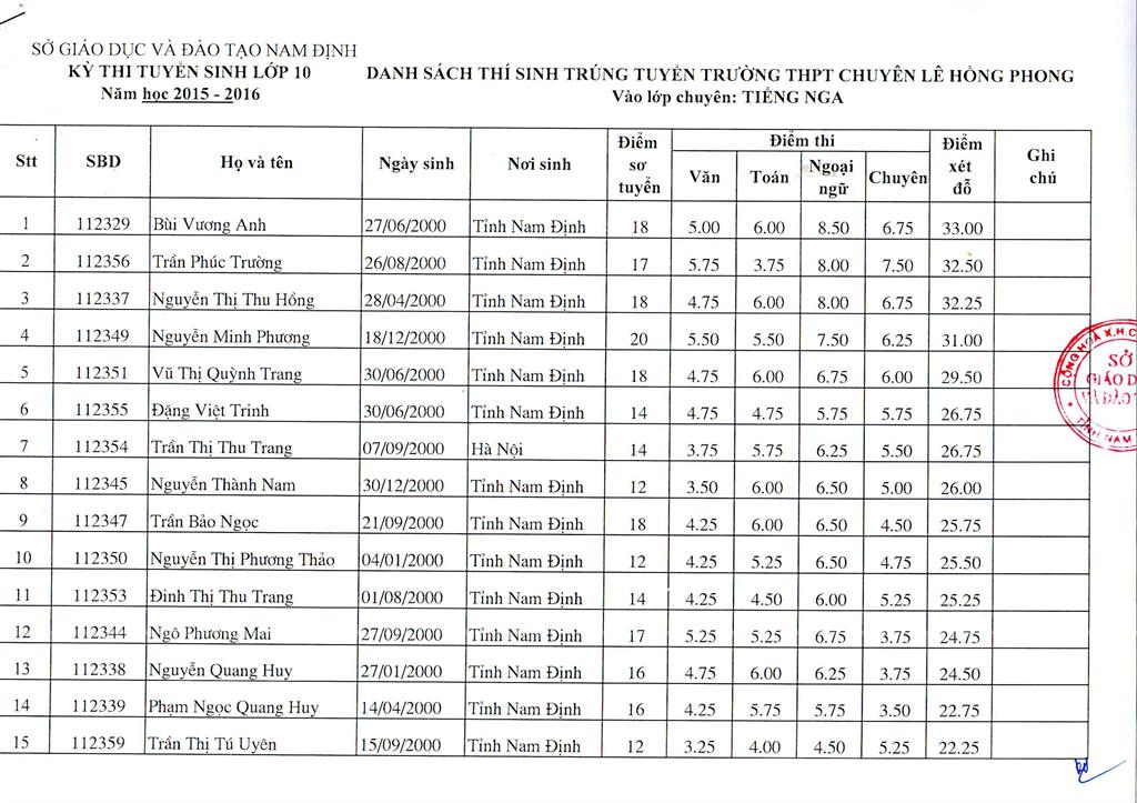 DANH SÁCH HỌC SINH TRÚNG TUYỂN TRƯỜNG THPT CHUYÊN LÊ HỒNG PHONG NĂM HỌC 2015 - 2016