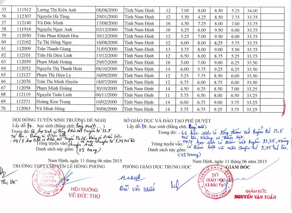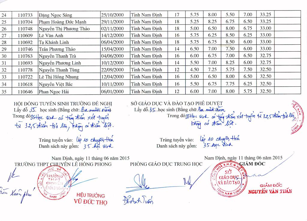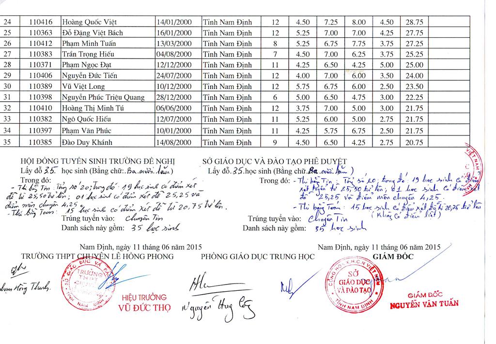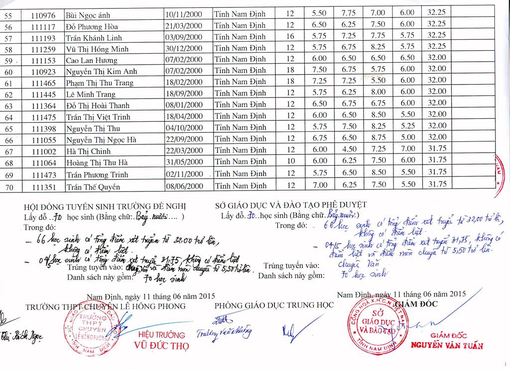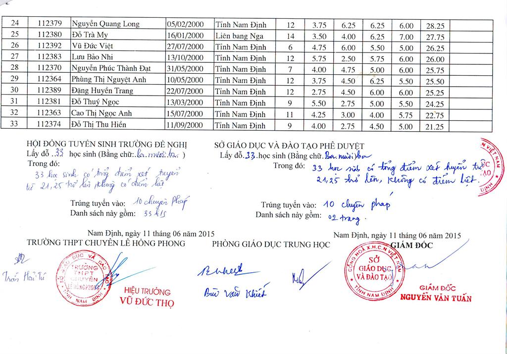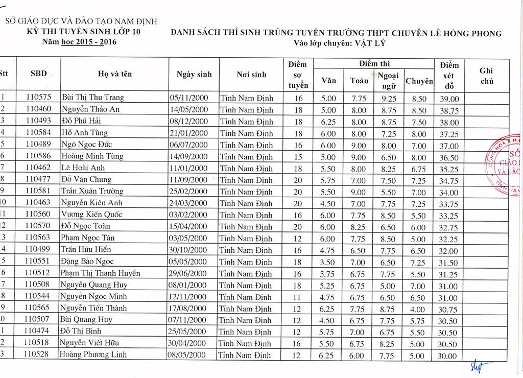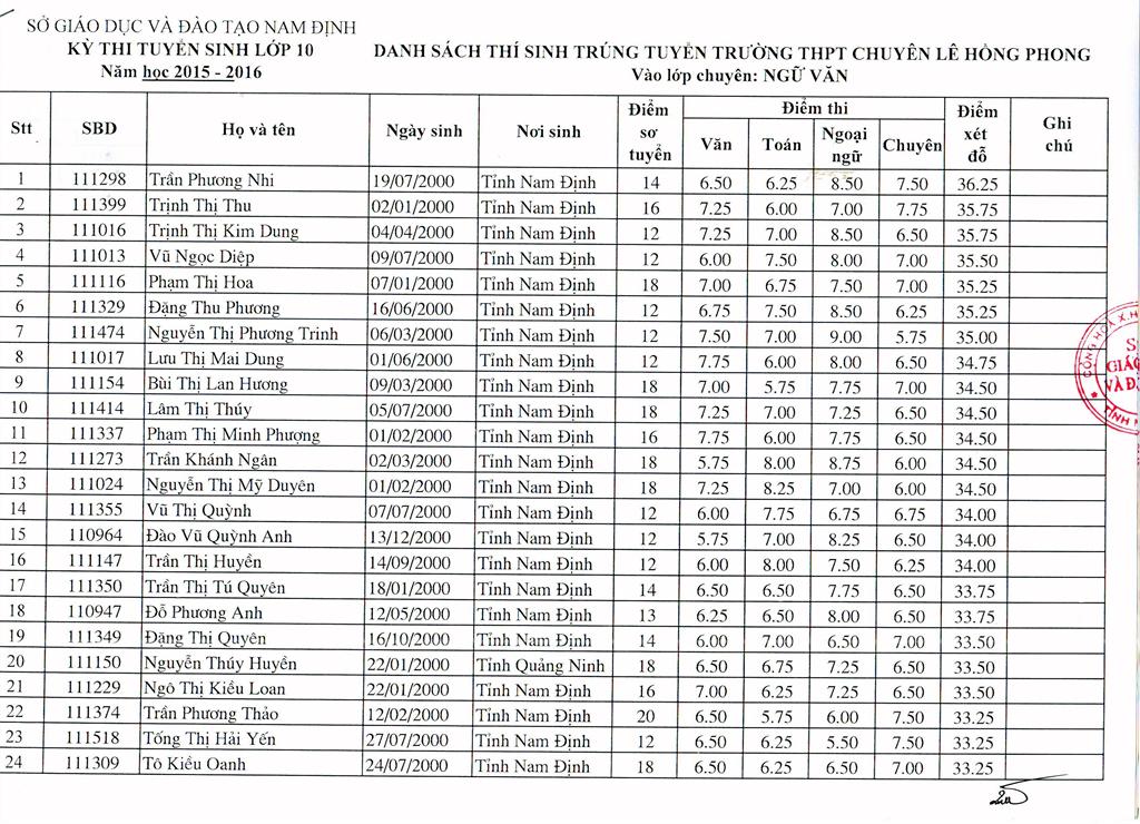DANH SÁCH HỌC SINH TRÚNG TUYỂN TRƯỜNG THPT CHUYÊN LÊ HỒNG PHONG NĂM HỌC 2015 - 2016
