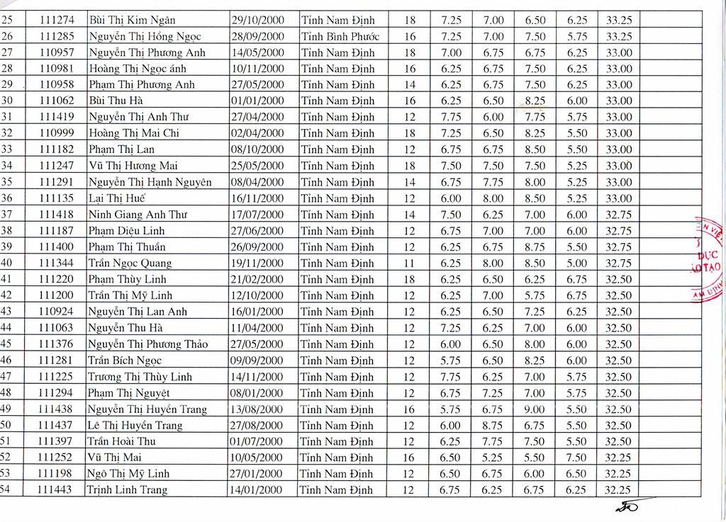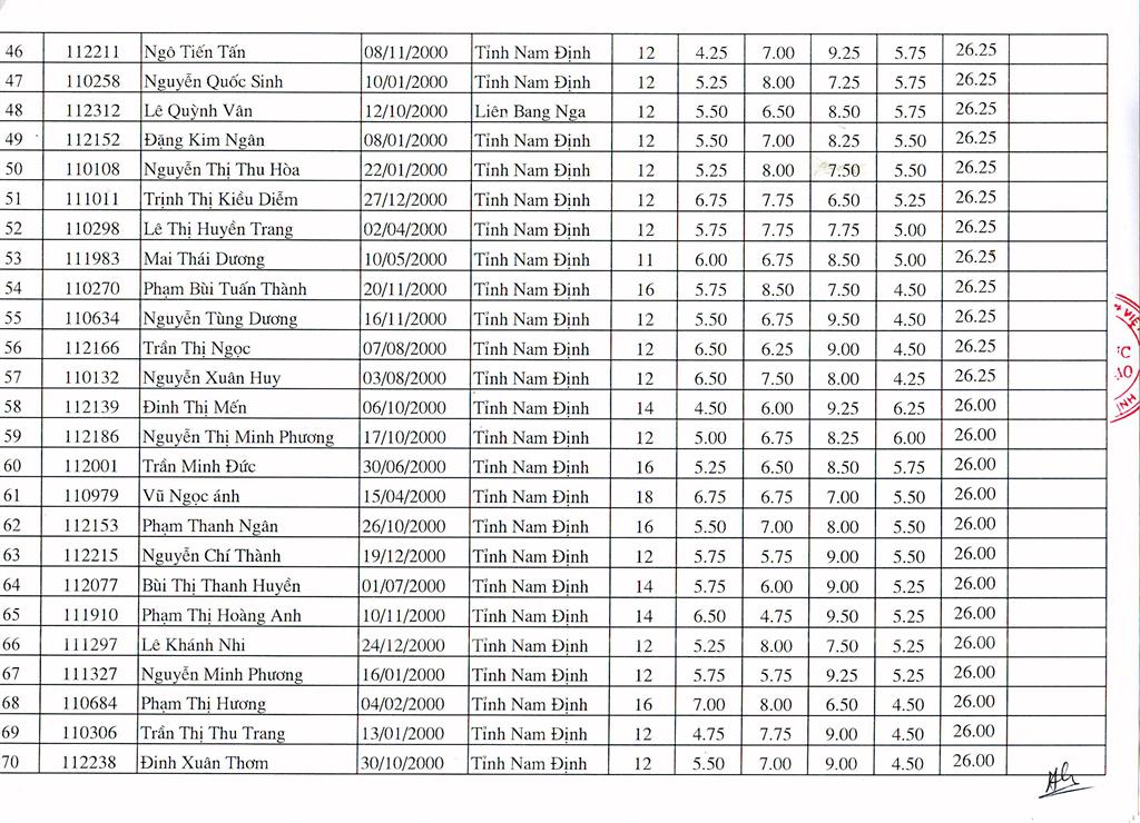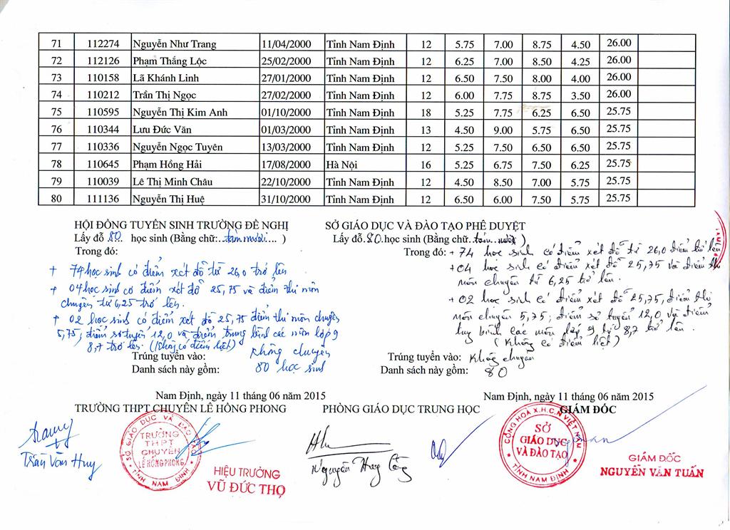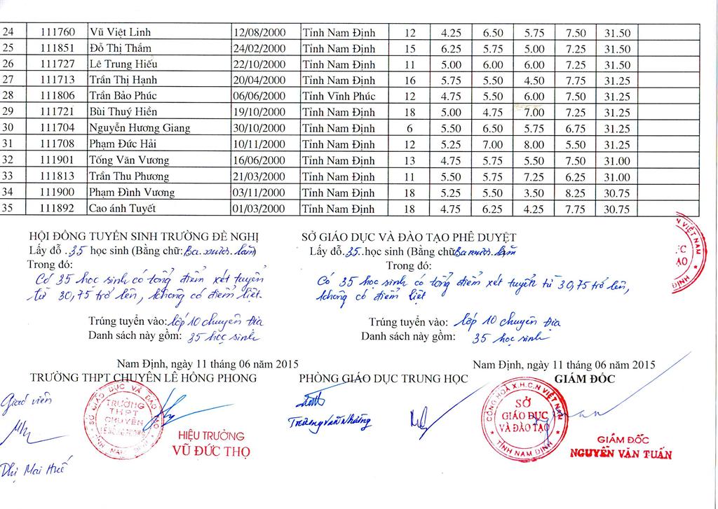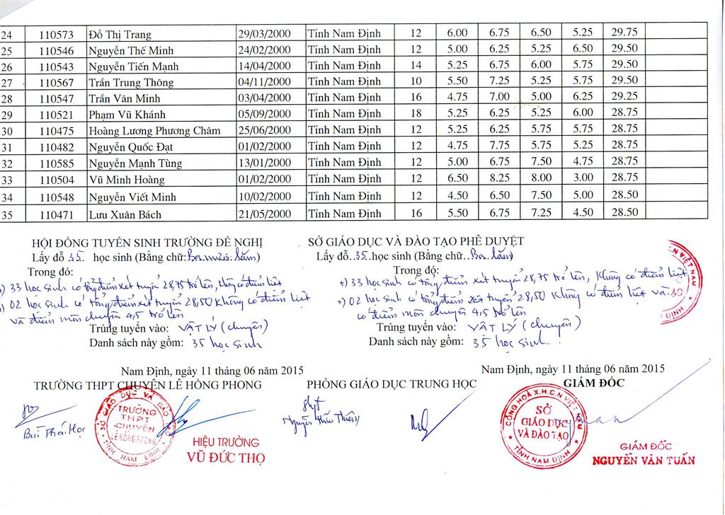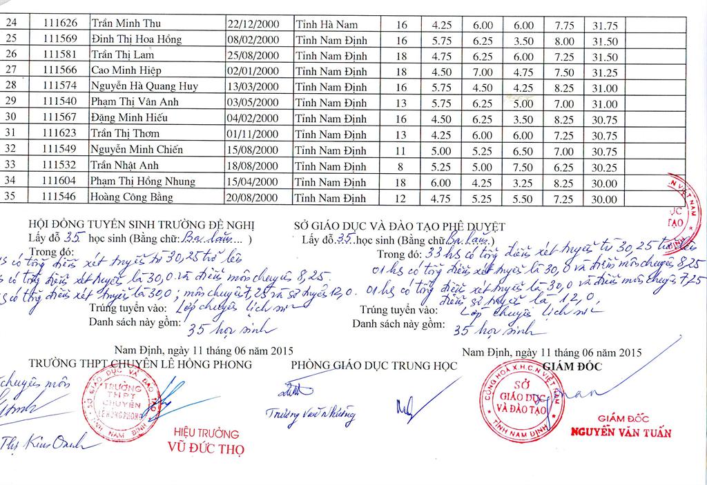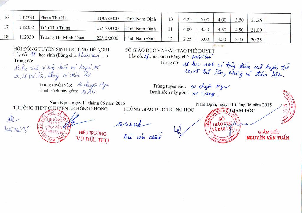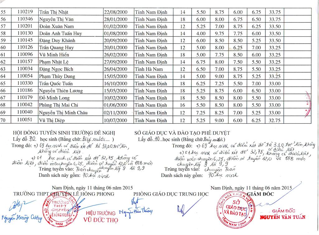 DANH SÁCH HỌC SINH TRÚNG TUYỂN TRƯỜNG THPT CHUYÊN LÊ HỒNG PHONG NĂM HỌC 2015 - 2016