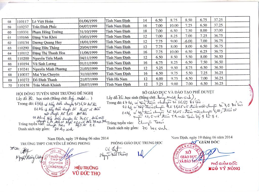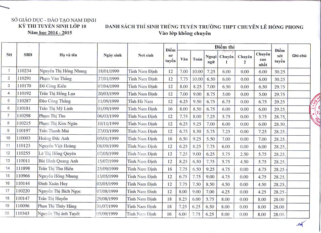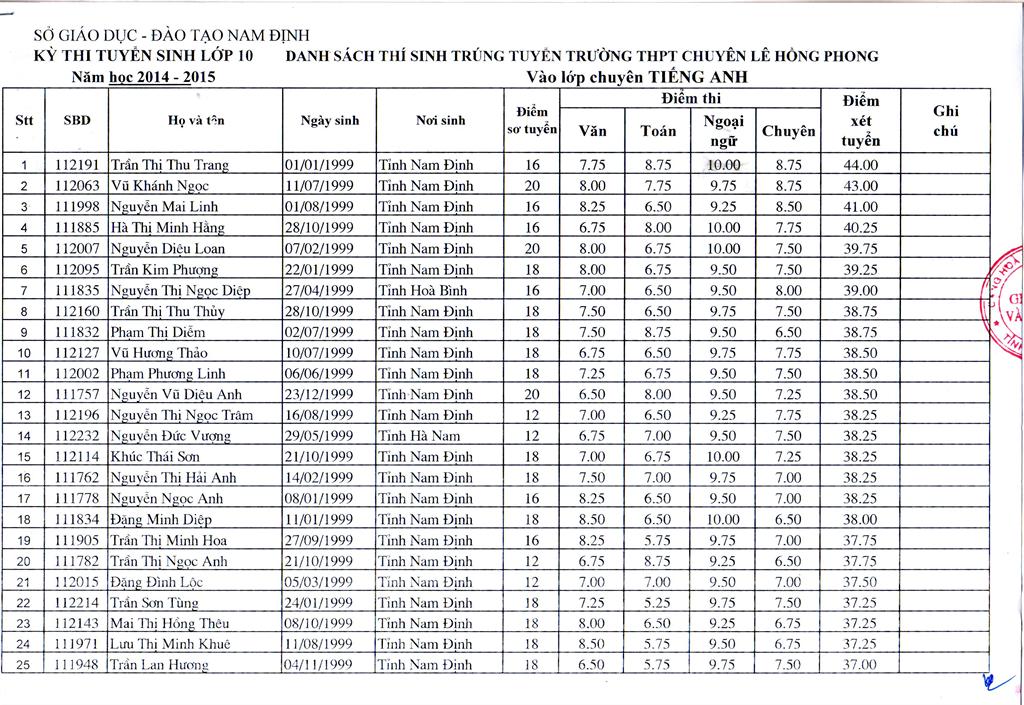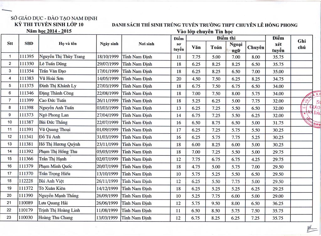 Danh sách thí sinh trúng tuyển vào lớp 10 trường THPT chuyên Lê Hồng Phong năm học 2014 - 2015