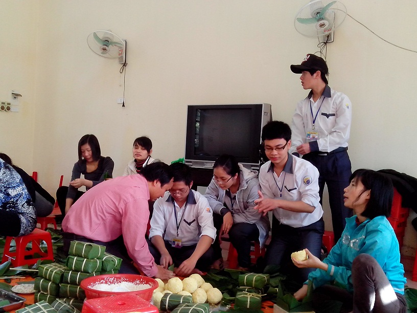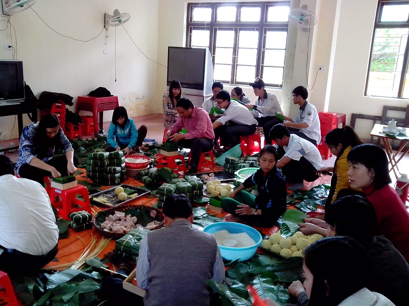 thầy cô còn có các em học sinh, cùng chuẩn bị nguyên liệu và học cách gói chiếc