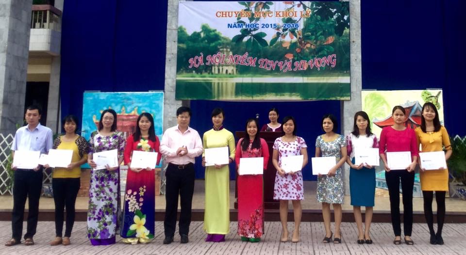 Thầy giáo Vũ Đức Thọ - Hiệu trưởng nhà trường trao thưởng cho các giáo viên đạt giải cuộc thi “GV sáng tạo trên nền tảng CNTT năm 2015”.
